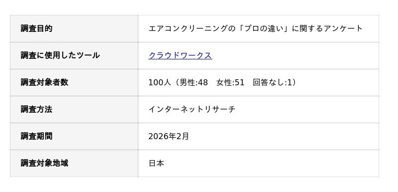 エアコンクリーニングの「プロの違い」に関するアンケート調査の概要