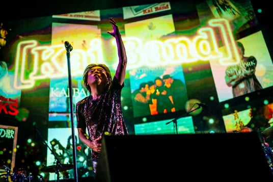 年の瀬も押し迫った12月26日。東京・豊洲PITにはプラチナチケットを手にしたファンが長蛇の列を成した。武道館の直後に開催されるライブハウス公演。甲斐バンド史上初めてステージの映像演出にLEDスクリーンを導入し、歌詞をフィーチャーした新機軸に臨むとの事前アナウンスもあった。高まる期待と迸る熱気が冬至の寒さを吹き飛ばしていく。会場に入ると、舞台前方に下ろされた紗幕に映し出された[Kai Band]のロゴマークが、旗印のようになびいていた。