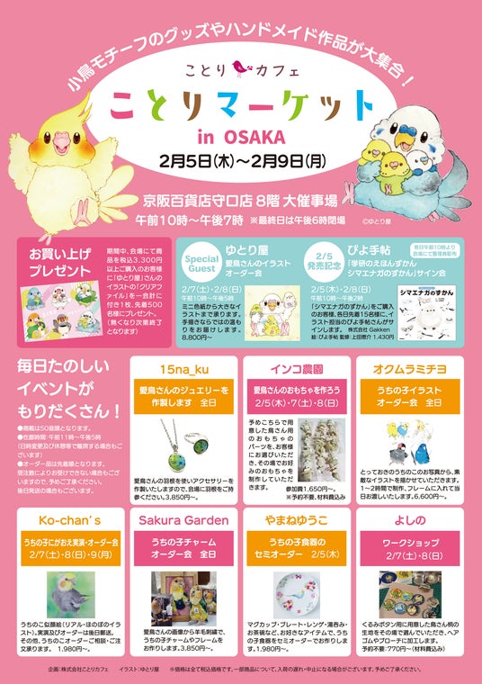 「小鳥たちを眺めながら、まったりコーヒータイム♪」をコンセプトにした「ことりカフェ上野本店」(http://kotoricafe.jp/)を運営する株式会社ことりカフェ(本社:東京都台東区 代表取締役 川部志穂)は、2026年2月5日~9日の5日間、京阪百貨店守口店(大阪府守口市)にて、「ことりマーケット大阪」(企画:ことりカフェ)を開催いたします。小鳥を愛するクリエイター作品が全国より大集結!人気作家の在廊もお楽しみいただけます。鳥まみれの素敵な作品が勢ぞろいした会場をお楽しみください。お菓子や飼育用品、あったグッズのセールコーナーもございます。