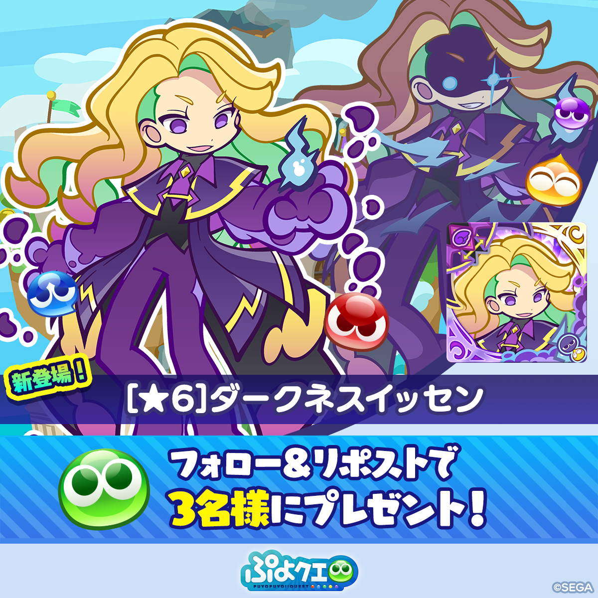 内容:『ぷよぷよ!!クエスト(ぷよクエ)』公式Xアカウントと公式Instagramアカウントにて、キャンペーンに参加した方の中から抽選でそれぞれ3名様に、「[★6] ダークネスイッセン」をプレゼントするキャンペーンを開催します。