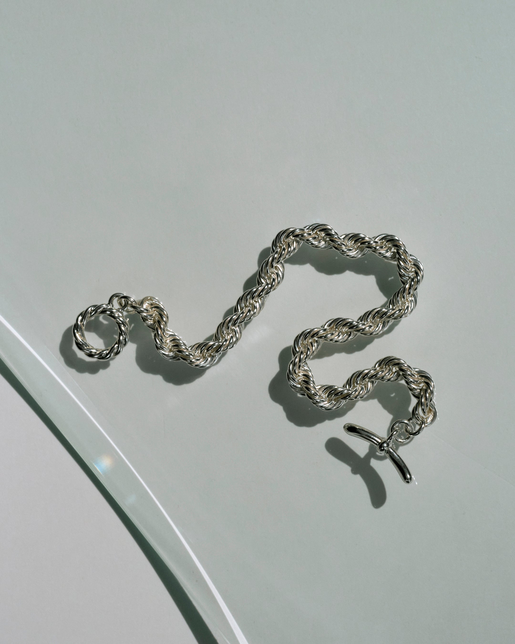 シルバーならではの地金感があるロープチェーンのブレスレット。すっきりとしたシルエットの中に編み込まれたディテールのコントラストが表情を生むデザインは、経年美化で深みを増し、唯一無二の存在感を放ちます。