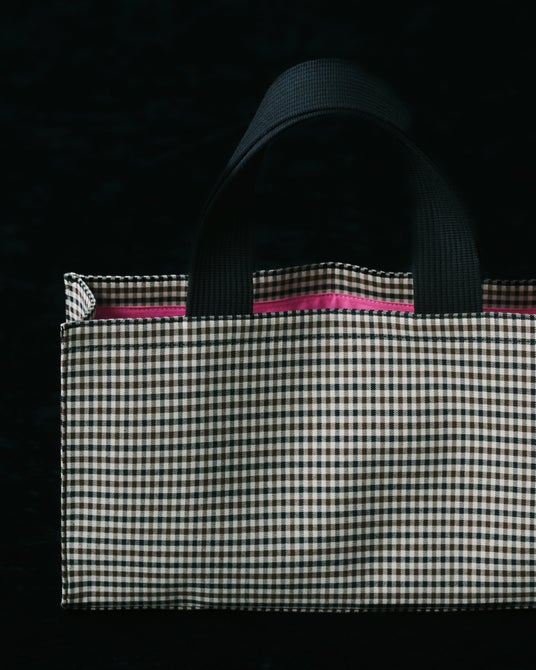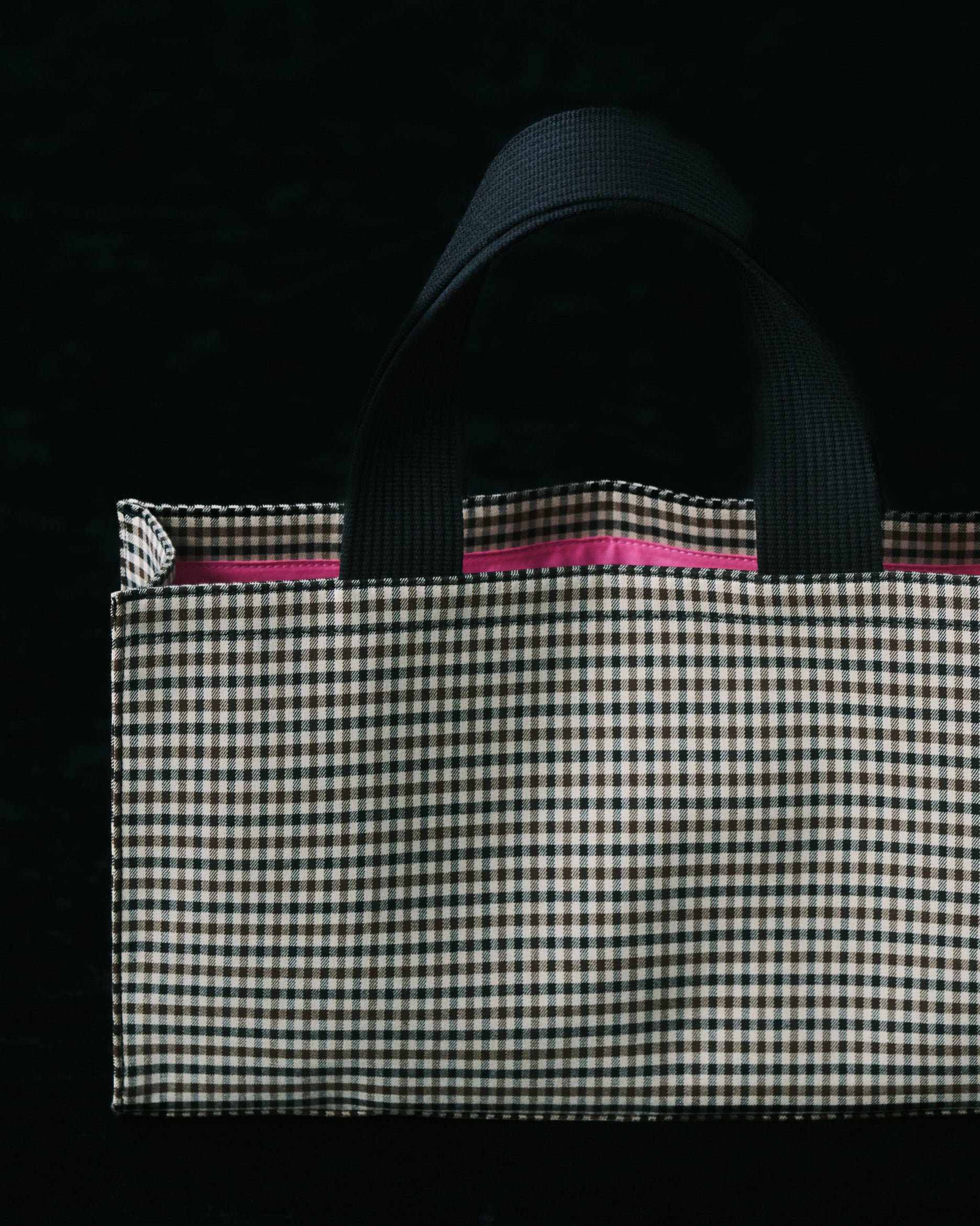 内側には鮮やかなピンクの裏地を配し、さりげないアクセントに。セットの同素材スカーフ(バンダナ)は荷物の目隠しにも。内ポケットは4つ配置、底部分には芯を入れることで安定感も担保した、デザイン性と機能性を両立させた仕様に仕上げています。
