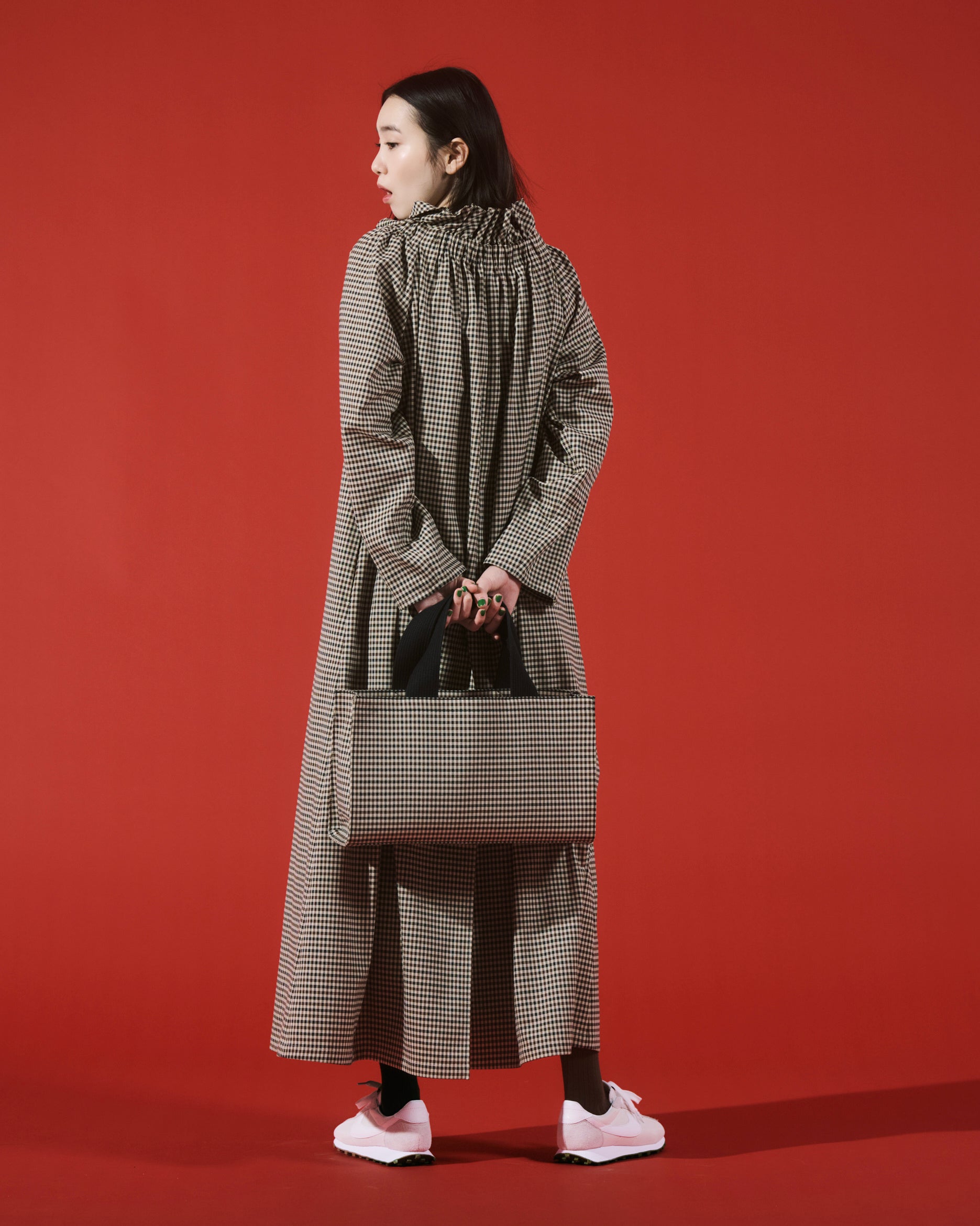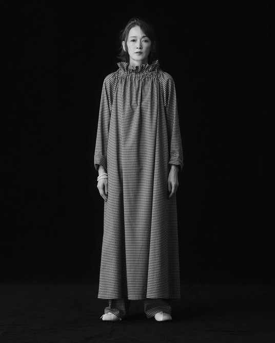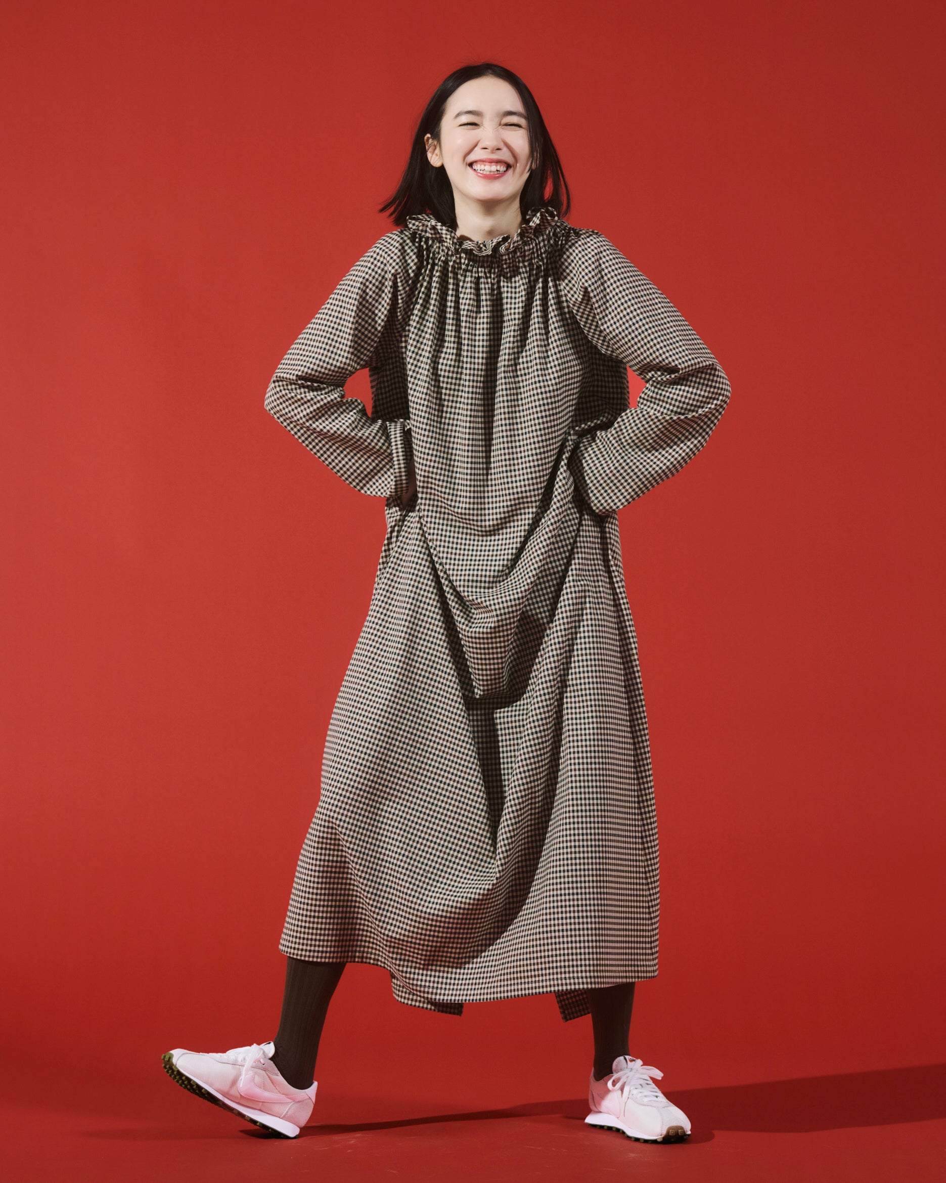 こちらは当初ブラウスとして構想されていたデザインを、試作を重ねる中でワンピースへと昇華した一枚。首元はゴム仕様で着脱しやすく、リラックスした着心地を叶えています。