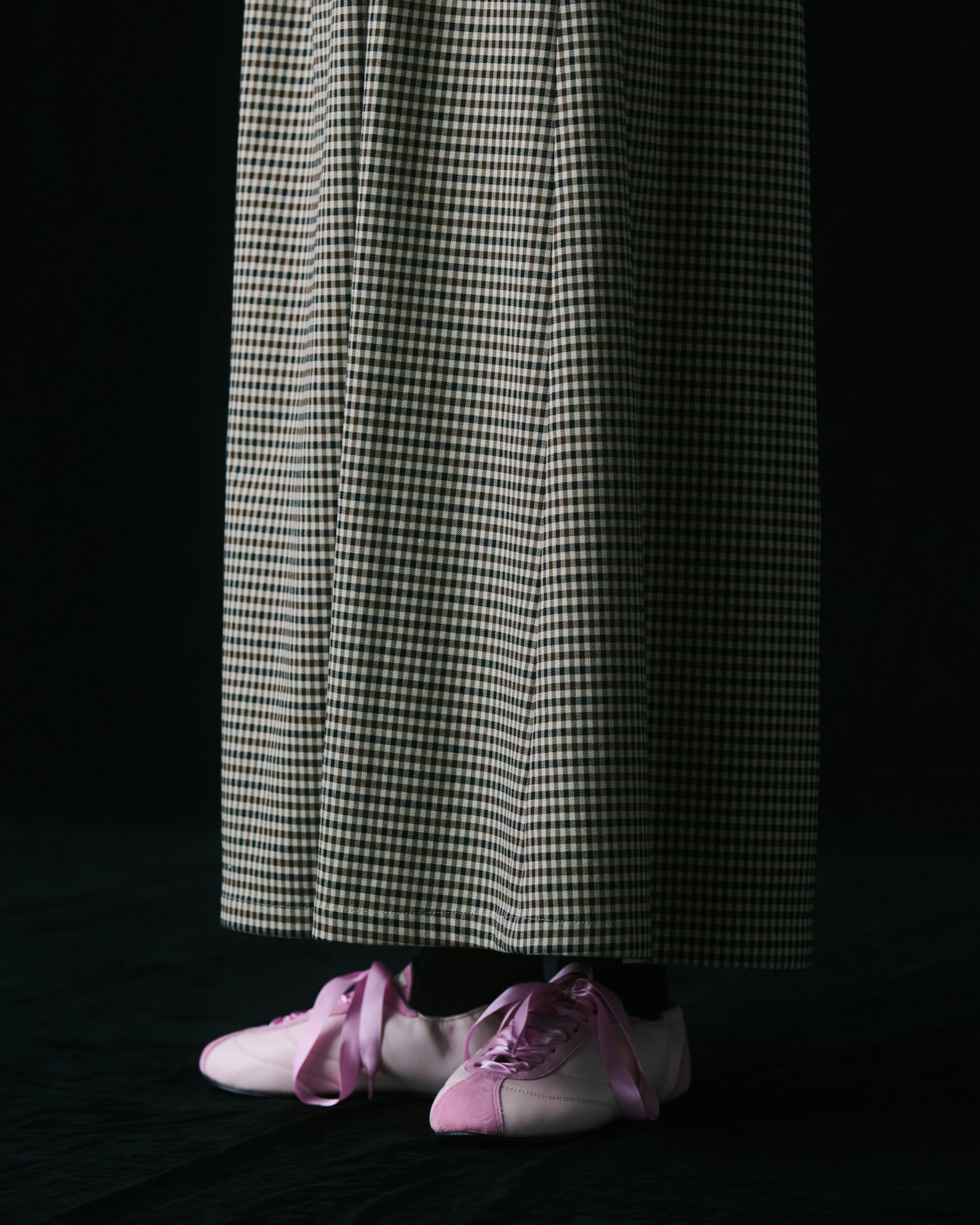 深めのタックを施したワイドテーパードシルエットで、リラックス感がありながらもすっきりとした印象に。ウエストはゴム仕様でイージーな履き心地を叶えつつ、ピンクのコードや内側のピンクパイピングなど、マナさんらしい遊び心のあるティテールをプラスしています。