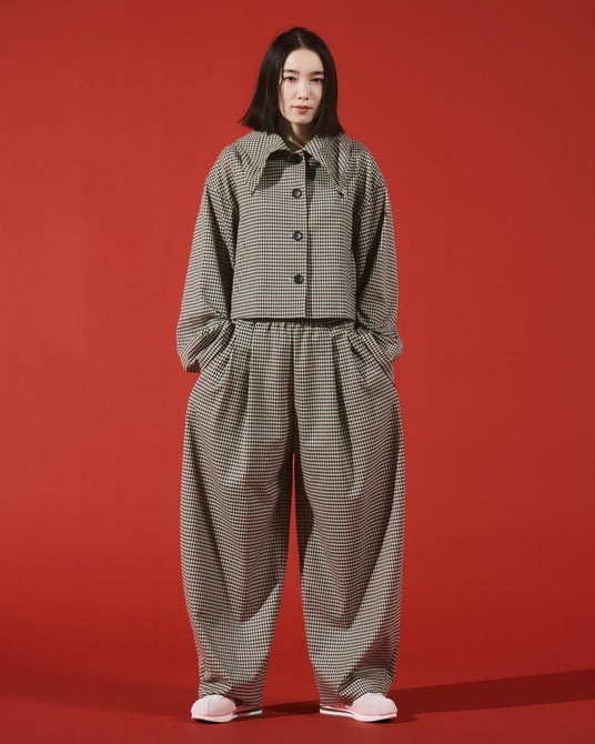 ジャケットと同じシェパードチェック柄を採用したタックパンツ。