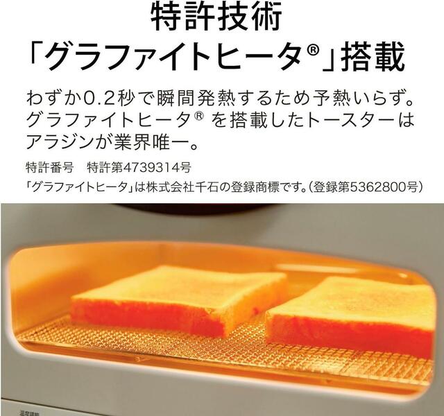 「グラファイト トースター 2枚焼き AET-GS13D(G)」は、独自の特許技術「遠赤グラファイト」を搭載した2枚焼きトースターです。スイッチを入れるとわずか0.2秒で発熱し、高温の庫内で一気に焼き上げるのが特長。