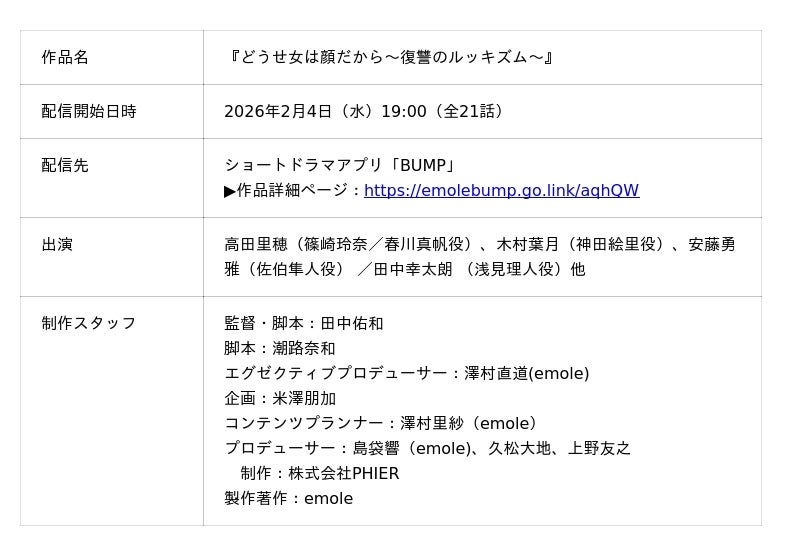 ショートドラマアプリ「BUMP」を運営するemole株式会社(本社:東京都目黒区、代表取締役:澤村直道、以下 emole)は、完全オリジナルストーリーのBUMPオリジナルショートドラマ『どうせ女は顔だから~復讐のルッキズム~』を2026年2月4日(水)19:00よりBUMP独占配信いたします。