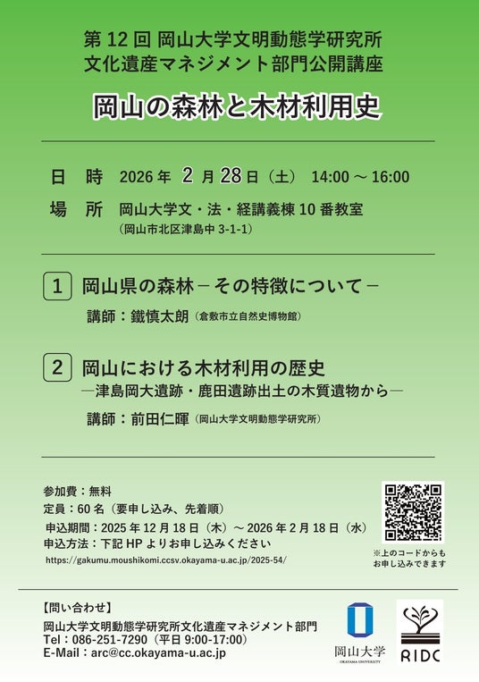 国立大学法人岡山大学(本部:岡山市北区、学長:那須保友)の高等先鋭研究院を構成する文明動態学研究所文化遺産マネジメント部門では、2026年2月28日(土)14:00~16:00に本学津島キャンパスにおいて第12回文明動態学研究所文化遺産マネジメント部門公開講座「岡山の森林と木材利用史」を開催します。