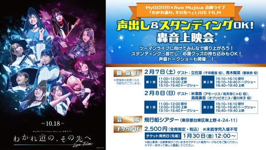 株式会社ブシロードムーブ(本社:東京都中野区、代表取締役社長:大貫佑介、以下ブシロードムーブ)は、映画『MyGO!!!!!×Ave Mujica 合同ライブ「わかれ道の、その先へ」 LIVE FILM』のトークイベント付き轟音上映会を2月7日(土)、2月8日(日)の2日間にわたり開催いたします。報道関係の皆様におかれましては、ぜひ本情報をお取り扱いいただけますよう、お願い申し上げます。