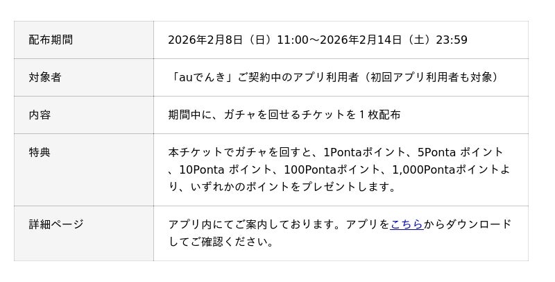 auエネルギー&ライフ株式会社(本社:東京都千代田区、代表取締役社長:齋藤 茂、以下 auエネルギー&ライフ)は、auでんきアプリをご利用のお客さまを対象に、最大1,000 Pontaポイントが当たる“バレンタインデー限定ガチャ”を実施します。期間中にアプリを起動するだけでガチャチケットを1枚受け取ることができ、どなたでも1回ガチャをお楽しみいただけます。