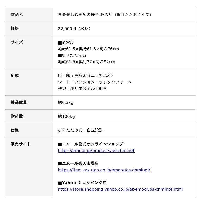 「寝る、座る、たたむ」に専門性を持った健康家具ブランドEMOORを展開する株式会社エムール(東京都立川市:代表取締役 高橋 幸司(以下、エムール))は、2026年2月5日より「食を楽しむための椅子~みのり~折りたたみタイプ(以下、みのり折りたたみタイプ)」の先行予約販売(2026年2月中旬入荷予定分)を開始しました。