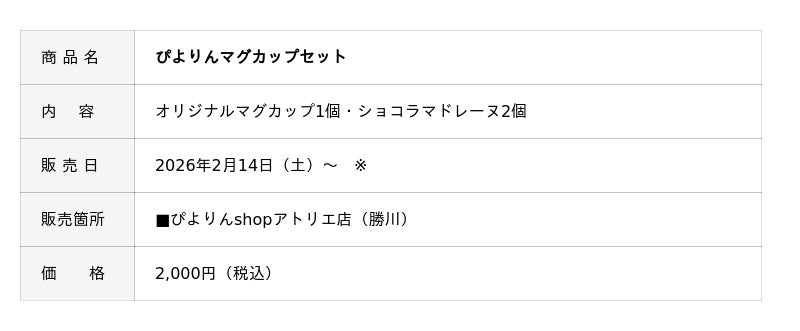 ジェイアール東海フードサービス株式会社(本社:愛知県名古屋市、代表取締役社長:岩下賢一)は、ぴよりんshopアトリエ店の開業二周年を記念し、アトリエ店限定のマグカップとマドレーヌのセットを、2026年2月14日より数量限定で販売します。ぴよりんshopアトリエ店ならではの限定商品として、ご来店の記念や贈り物におすすめです。