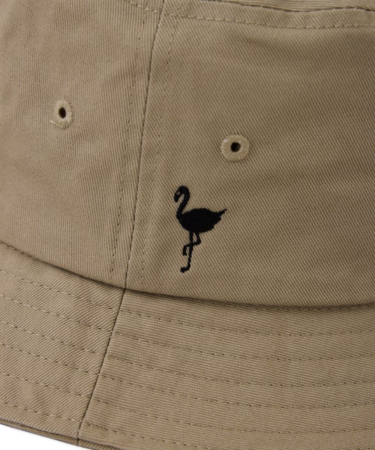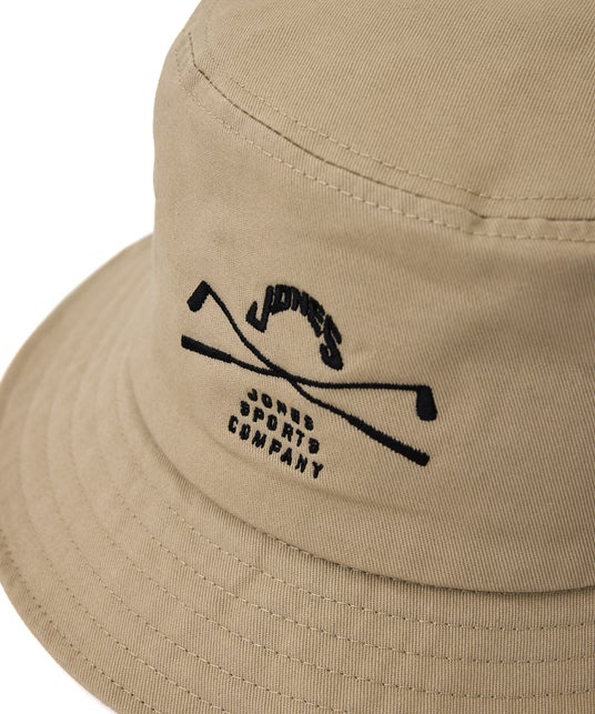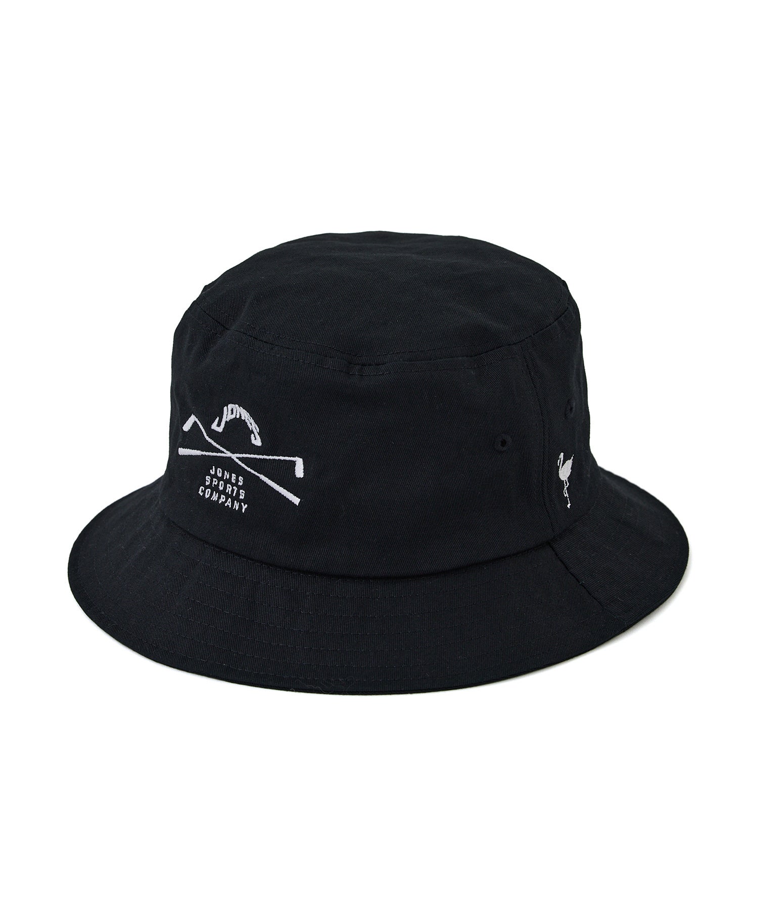フロントに「JONES」モチーフの刺繍を、サイドには「JUN&ROPE」のブランドアイコンであるフラミンゴの刺繍を配した、シンプルながらもシルエットにこだわったバケットハット。光沢感のあるツイル素材を使用した、耐久性にも優れたアイテム。