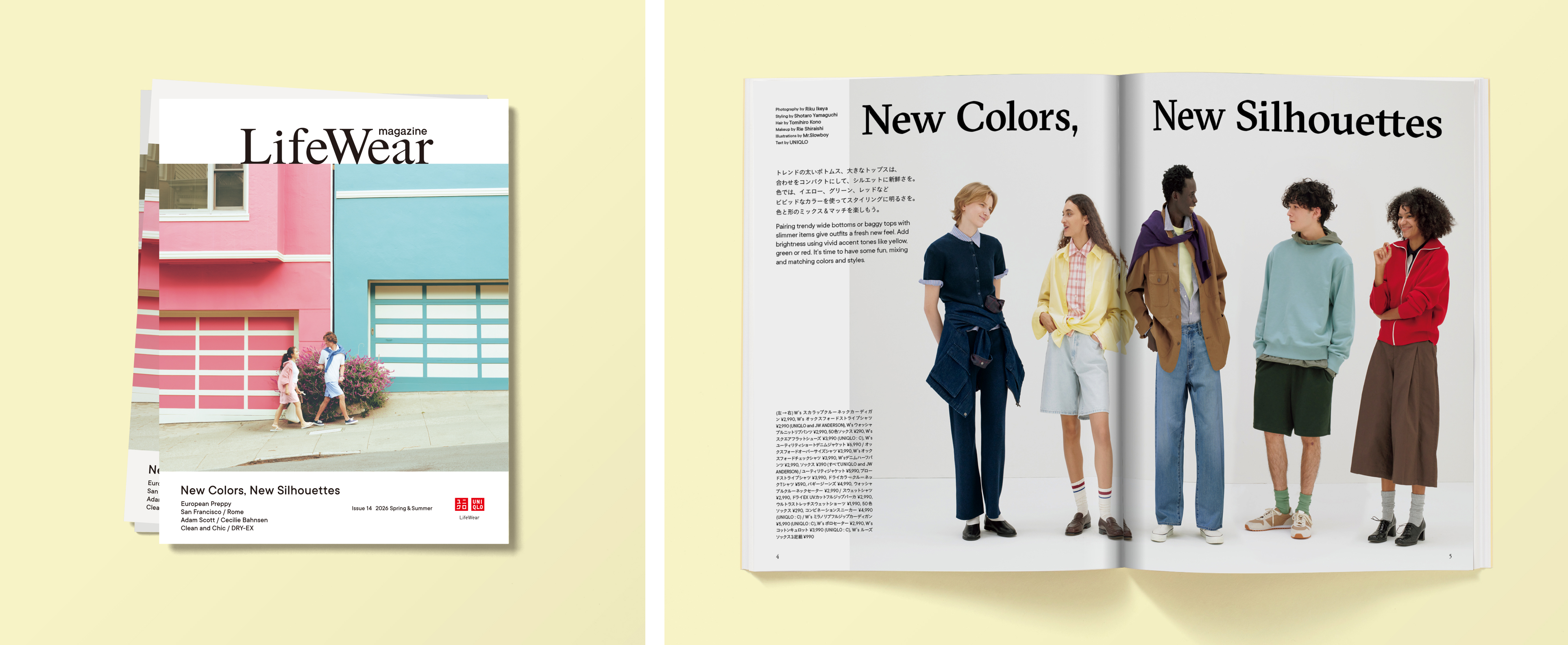 『LifeWear magazine』は、人々の生活をより豊かに快適にするユニクロの「LifeWear」のフィロソフィーを 伝えるフリーマガジンです。第14号となる2026年春夏号は、“New Colors, New Silhouettes”をテーマに 掲げ、今季らしいビビッドな色とシルエットに着目しました。スタイリングは発色のいいカラーを取り入れて明るく、鮮やかに。シルエットもメリハリをつけて今らしく。この春夏、ユニクロが提案するフレッシュなスタイルをさまざまな角度から伝える一冊です。