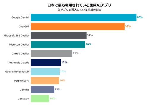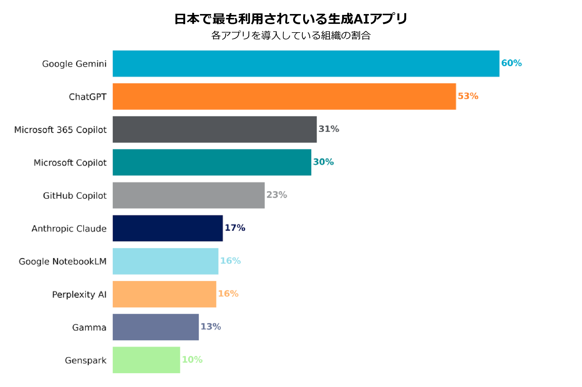 Netskope Threat Labsが2023年初頭に企業における生成AIアプリの使用状況の調査を開始して以来、ChatGPTは競合他社をリードし続けてきました。しかし日本では、Google Geminiが使用率でChatGPTを上回り、世界で初めてChatGPT以外のサービスが首位となりました。企業承認済みの生成AIツールの導入が加速する中、主要ソフトウェアに統合された生成AIツールの利用も全般的に拡大しています。