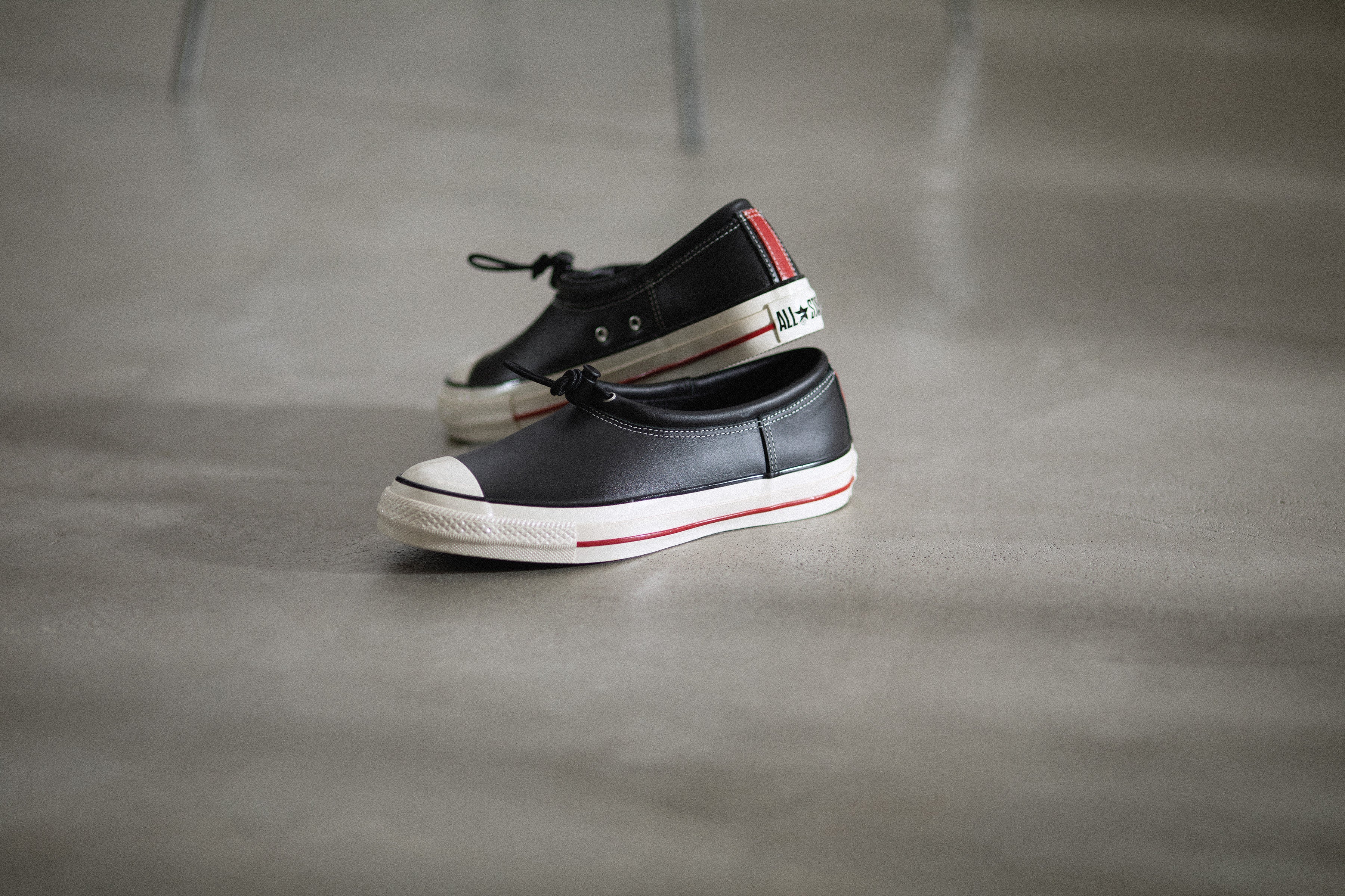 ALL STAR AGEDのパターンアレンジモデル。90年代後半から2000年代初頭に展開された「CHUCK TOGGLE」のアーカイブ由来のディテールを取り入れ、再構築しています。脱ぎ履きしやすいトグル仕様を採用し、ソフトなレザーのアッパーやレザーを2枚重ねたバックタブなど、オリジナルのディテールを踏襲したデザインが特徴です。 アッパーのブラックレザーに、テープに施したレッドのラインをアクセントとして取り入れています。