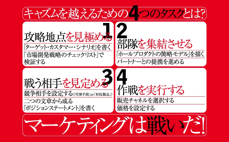 製品が市場に浸透するまでのプロセスを「イノベーター→アーリー・アドプター→アーリー・マジョリティー→レイト・マジョリティー→ラガード」といった5つのグループで分類した「テクノロジー・ライフサイクル」。本書では、特に初期市場(アーリー・アドプター)とメインストリーム市場(アーリー・マジョリティー)の間に潜む「キャズム」をいかにして飛び越えるかを実戦的な4つのタスクにわけて解説します。