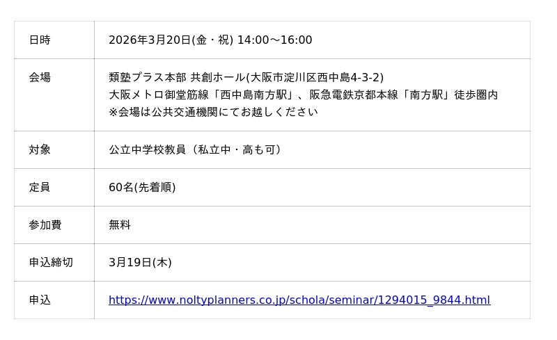 株式会社NOLTYプランナーズ(本社:東京都中央区、代表取締役社長:細野 肇)は、公立中学校教員を対象としたセミナー「中学・高校でできる非認知能力育成の実践」を、2026年3月20日(金・祝)に大阪で開催します。