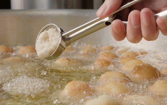 お店でうどんをミキサーにかけてペースト状に。数時間おきにひく白だしを生地に加えるのが丸亀製麺ならではのこだわり。旨みと香り高い風味をプラスします。もっちもち食感を生みだすために空気を含ませながらやさしく粉と混ぜ合わせ、生地を少し寝かせます。丸い形に整えて、ひとつずつ丁寧に揚げたらできあがり。手づくりならではの素朴なおいしさをお楽しみください。