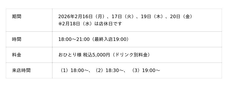 ※WEBからご予約の方は、「連絡事項」欄にご希望時間((1)18:00~、(2)18:30~、(3)19:00~)の記載をお願いいたします。