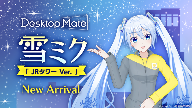 北海道を応援するキャラクター「雪ミク」と札幌のランドマーク「JRタワー」の特別なコラボレーションから生まれた、JRタワー Ver.の雪ミクです。通常の初音ミクとは異なる新規モーションを全編収録し、Desktop Mate上で見られる仕草や動きもすべて専用のものとなっています。