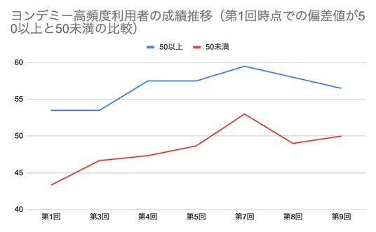 ヨンデミー高頻度利用者(週3回以上利用している生徒)の中で分析すると、偏差値のスタートラインが50以上でも50未満でも、どちらも成績の向上が見られました。つまり、ヨンデミー利用開始時の成績にかかわらず、ヨンデミーを利用すると成績が向上すると言えます。
