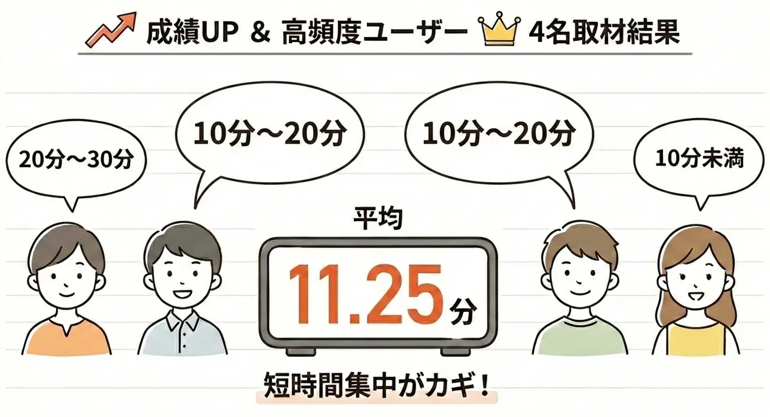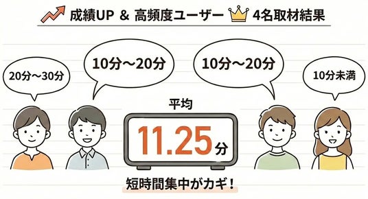 成績向上が見られたヨンデミー高頻度利用者(週3回以上利用している生徒)の1日あたりの読書時間は30分未満でした。長時間の読書ではなく、短時間でも高頻度で継続することで十分に効果が得られることが示されました。