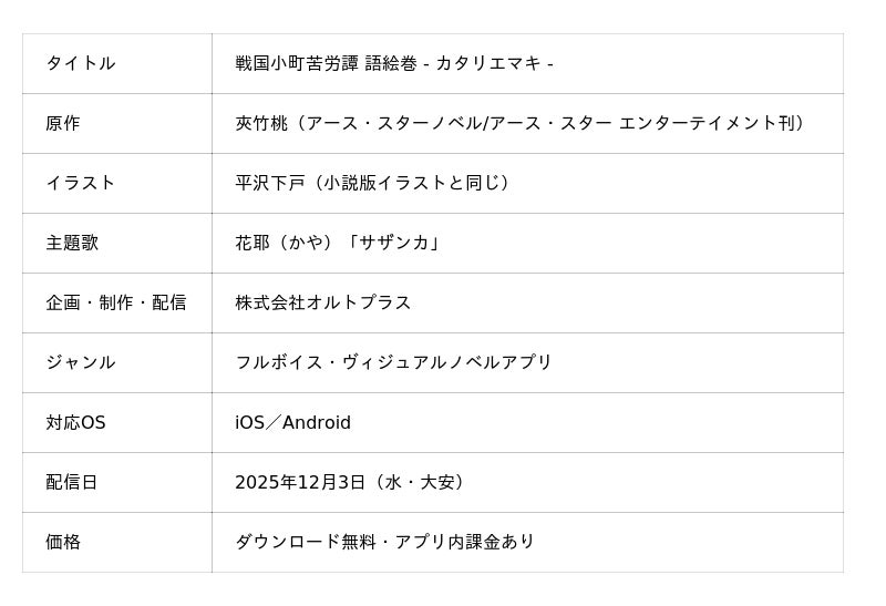 株式会社オルトプラス(本社:東京都豊島区、代表取締役社長:石井 武、以下「オルトプラス」)は、株式会社アース・スター エンターテイメント(本社:東京都品川区、代表取締役社長:幕内 和博)が出版する人気小説原作『戦国小町苦労譚』のフルボイス・ヴィジュアルノベルアプリ『戦国小町苦労譚 語絵巻 - カタリエマキ -』(以下「本アプリ」)において、追加エピソードとなる第三章・永禄十年 天下布武(1話~10話まで)を、本日2026年2月5日(木・大安)より配信開始したことをお知らせいたします。
