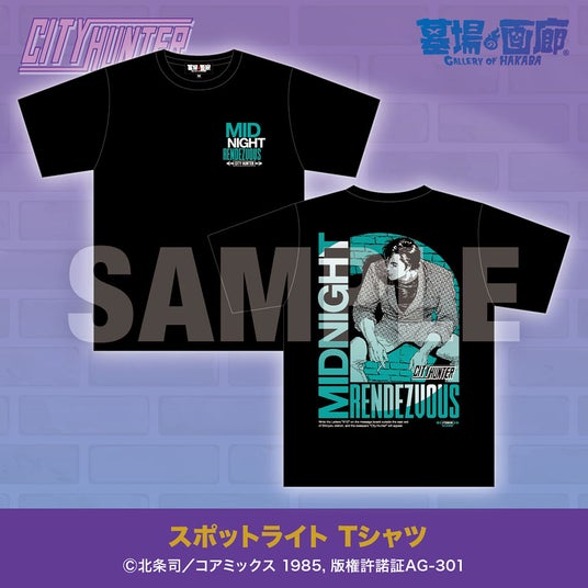ミッドナイト・ランデブーのキャッチコピーの通り、冴羽獠が誰かとの待ち合わせを予感させる喧騒の前の一瞬をレイアウトに落とし込んだ、まさに大人のためのTシャツ。
