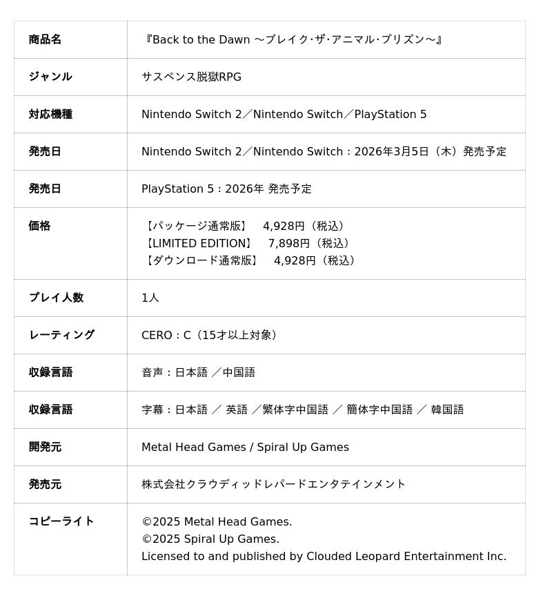 株式会社クラウディッドレパードエンタテインメント(本社:東京都品川区、代表取締役:陳 云云、以下CLE)は、Metal Head Gamesが開発する、サスペンス脱獄RPG『Back to the Dawn ~ブレイク・ザ・アニマル・プリズン~』(以下『Back to the Dawn』)につきまして、2026年2月5日(木)より、ニンテンドーeショップにて『Back to the Dawn 体験版』(Nintendo Switch 2版/Nintendo Switch版)の配信を開始しました。