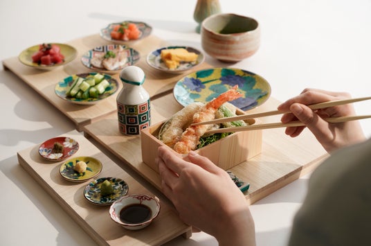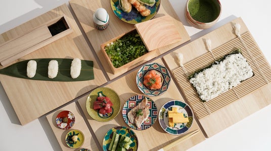 細巻き寿司を自分で巻いて楽しめる、Coilのメインセット。細巻き寿司・軍艦巻き・天ぷらに加え、抹茶を自分で点てて味わう体験つき。寿司ネタは約60種類から好きなもの(5種)を選べます。