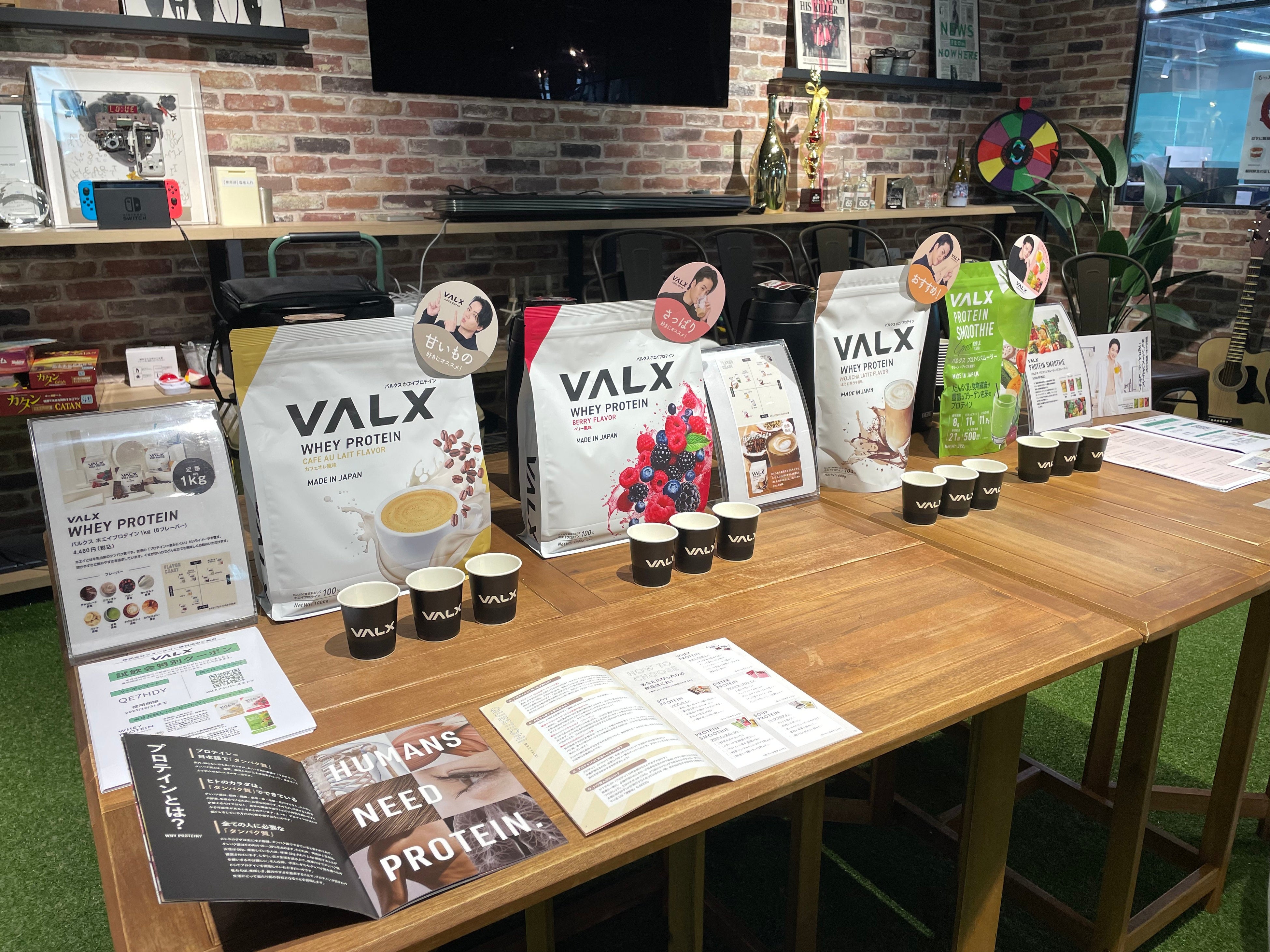 今回の試飲会では、VALXホエイプロテイン定番フレーバーに加え、数量限定フレーバーの「ほうじ茶ラテ風味」や女性にも人気の「プロテインスムージー」などを提供しました。