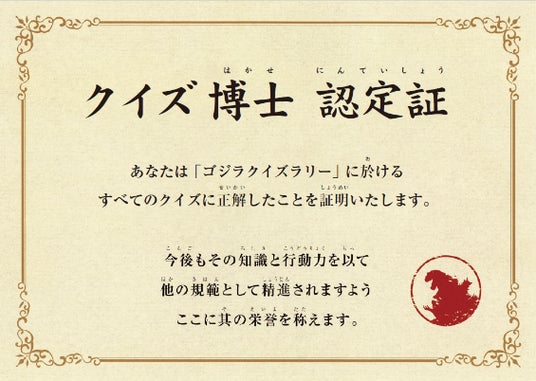 対象の方には、専用キットをお渡しいたします。「ゴジラ迎撃作戦」の各アトラクションを体験しながら、設置された4つのクイズに挑戦いただき、全問正解した方には、「ゴジラ迎撃作戦」限定グッズと“クイズ博士認定証”をプレゼントいたします