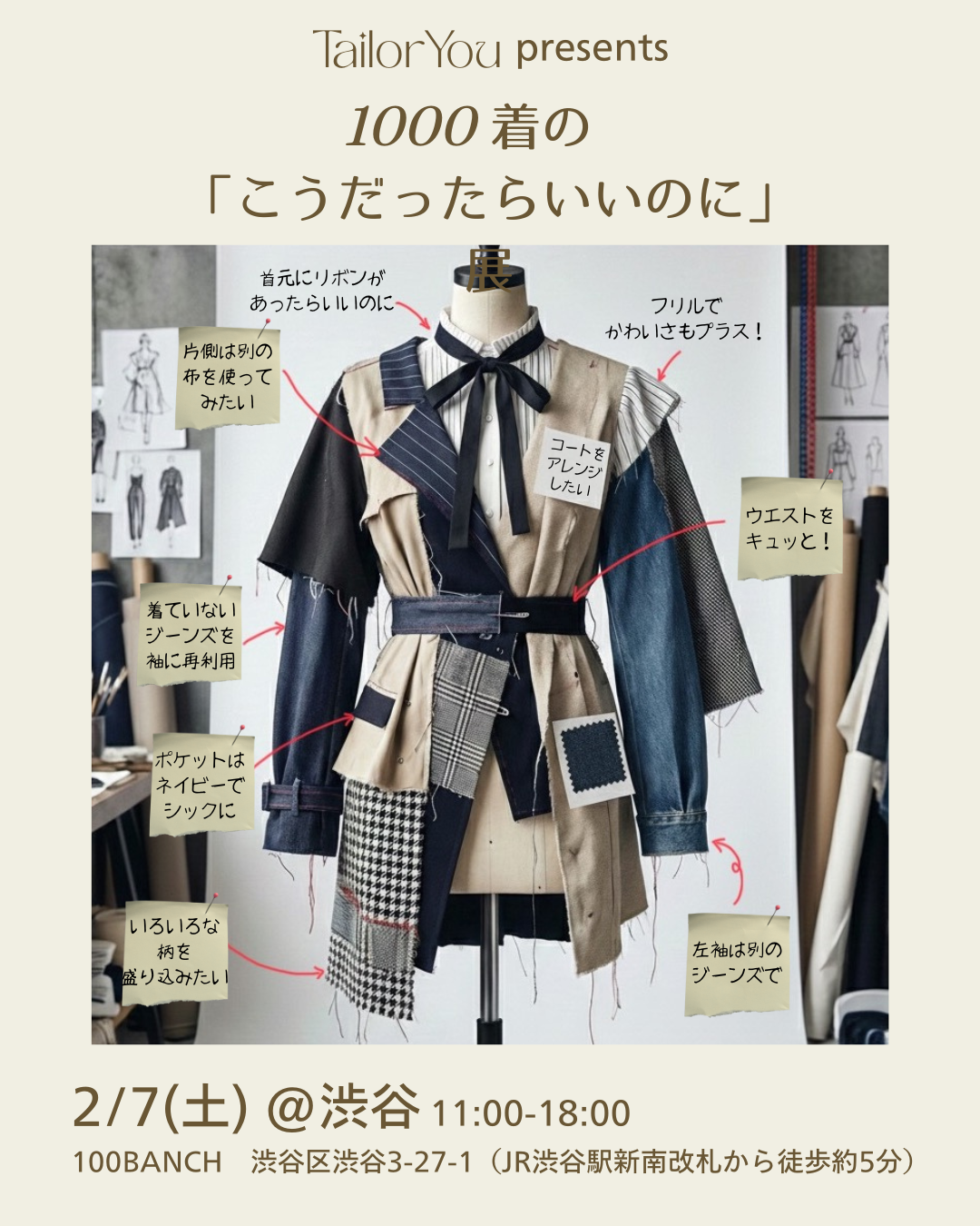 「100年先の世界を豊かにするための実験区」というコンセプトのもと、これからの時代を担う若い世代とともに新しい価値の創造に取り組む未来創造拠点「100BANCH」で活動するTailorYou(テイラーユー)は、2月7日に参加型展示イベント『1000着の「ここだけこうだったら」展』を開催します。服の理想を言葉や体験で可視化し、リメイクを通して自分の一着に近づける参加型展示で、既製服では満たしきれなかったニーズや、廃棄予定の服にも新たな可能性を見出していきます。