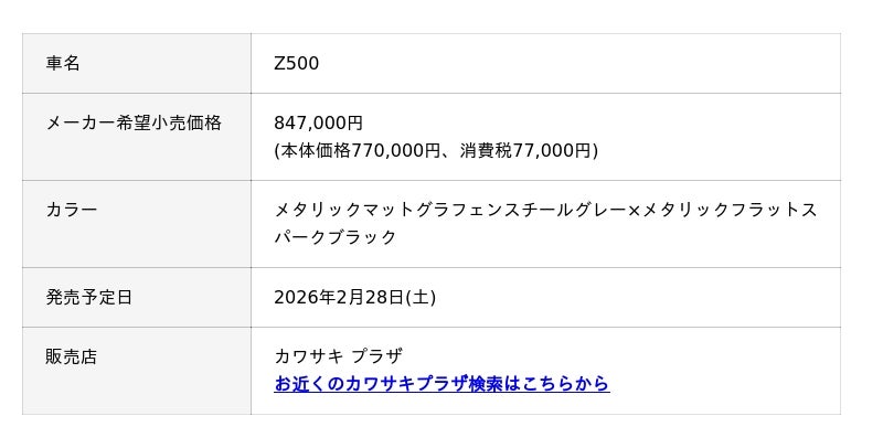 株式会社カワサキモータースジャパン(本社:兵庫県明石市、代表取締役社長:佐伯 健児)は、日本初導入となる「Z500」を、2026年2月28日(土)に新発売いたします。