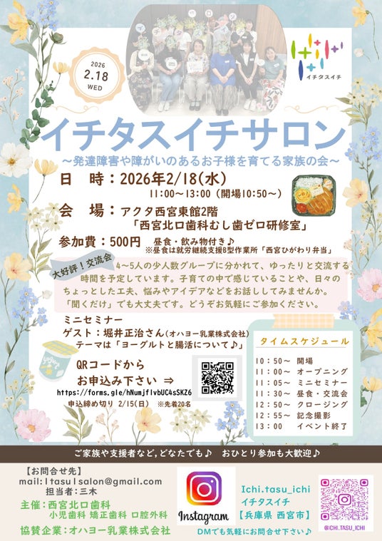 医療法人社団にしきた(西宮北口歯科 小児歯科 矯正歯科 口腔外科/兵庫県西宮市、理事長:児玉秀樹)は、発達障害や障がいのあるお子さまを育てるご家族のための交流の場「イチタスイチサロン」の第6回目を開催いたします。