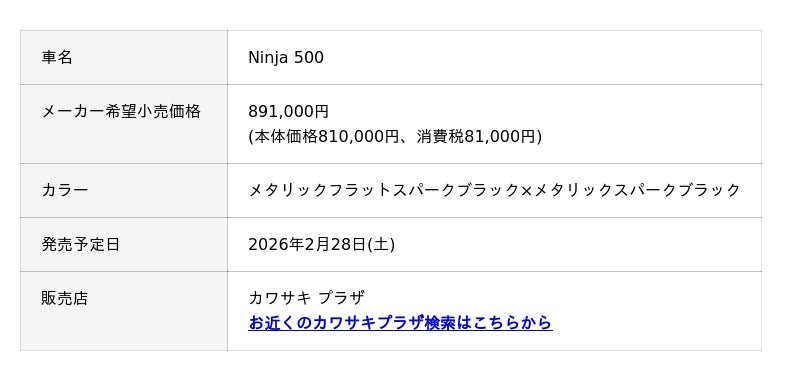 株式会社カワサキモータースジャパン(本社:兵庫県明石市、代表取締役社長:佐伯 健児)は、「Ninja 500」を、2026年2月28日(土)に新発売いたします。