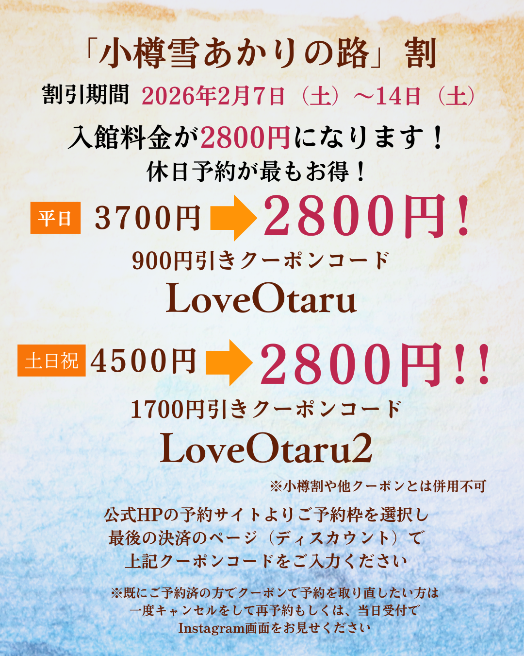 小樽雪あかりの路が開催される2月7日(土)~14日(土)の期間中、クーポン利用で毎日、入館料が2800円になります。