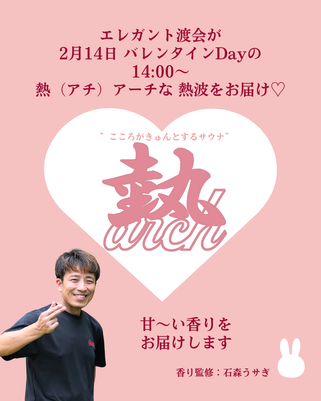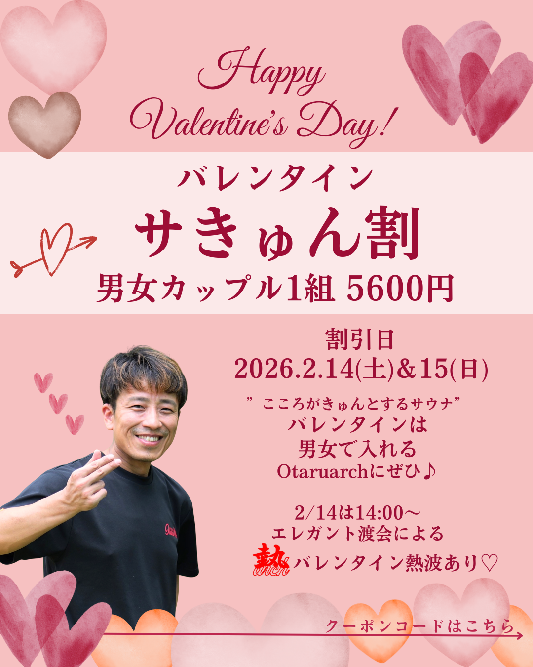 バレンタインの2月14日と翌日15日の2日間、バレンタインサきゅん割と題して、カップル利用が通常9000円のところ、5600円になります。14日14時からは、当施設所属の熱波師・エレガント渡会による熱~い熱波イベントがあります。
