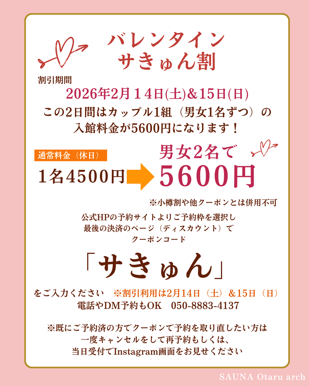 「あなたと小樽をつなぐサウナ」がコンセプトのSAUNA Otaru archでは、「小樽雪あかりの路」期間中にご予約のお客様に、入館料が2800円になる割引クーポンを配布しております。小樽雪あかりの路が28回目開催を記念し、2800円にしております。さらに2月といえば、バレンタインですね♪