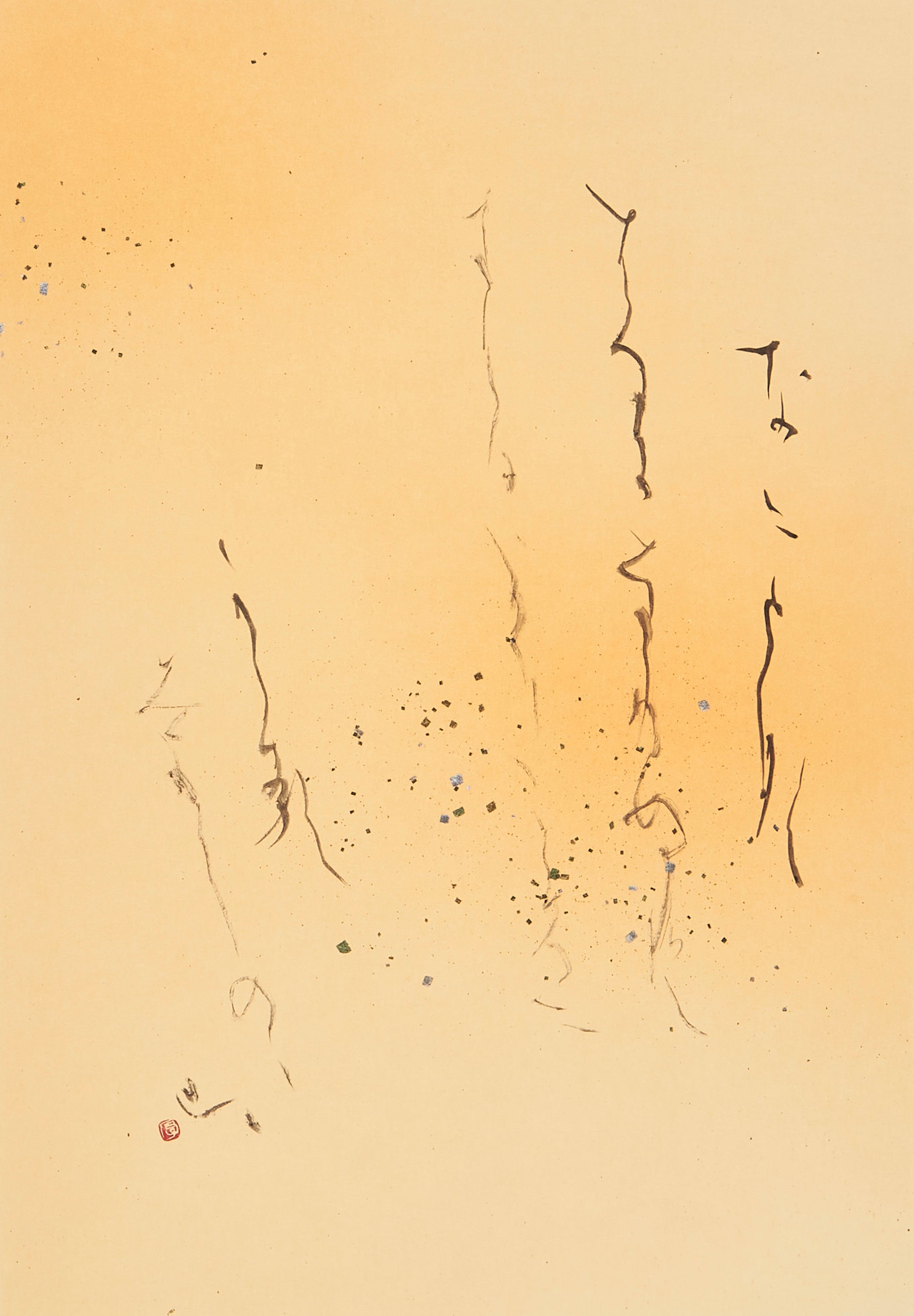 西行は、月に寄せる思いを数多くの和歌に託しました。その静謐な光と、心の奥に響く余情は、時を超えて私たちに語りかけてくれます。高木氏は、かな書のしなやかな線と余白の妙をもって、西行のその詩情を現代に映し出しました。「ありのままの自分で書こう、そう思い、作品に精一杯立ち向かいました。すべての作品、こんな景色を描きたいと願い筆を執ったものです。まだまだ途上ですが、皆様にはその景色を思い浮かべながらご鑑賞いただければ幸いです。」と高木氏。