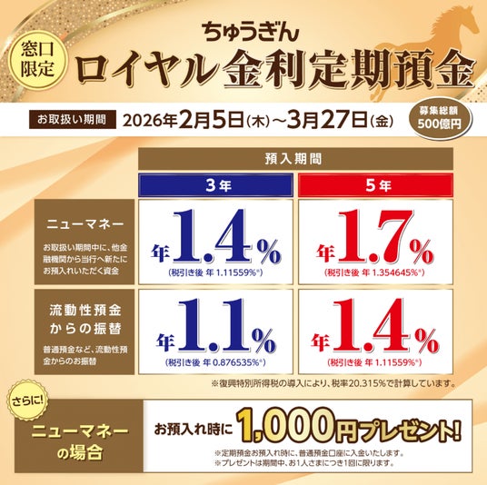 中国銀行(岡山市 頭取 加藤 貞則)では、2026年2月5日(木)より、「ちゅうぎんロイヤル金利定期預金キャンペーン」を実施します。