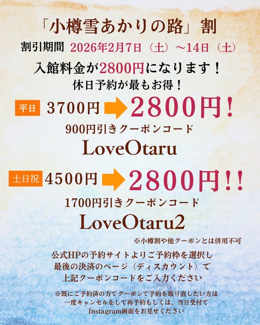 「第28回 小樽雪あかりの路」を記念して、2月7日~14日の期間中は入館料が平日3700円→2800円、土日祝4500円→2800円に♪2/14~15日はバレンタイン割 ペア利用9000円→5600円