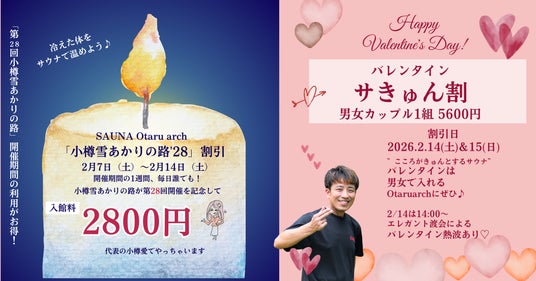 「あなたと小樽をつなぐサウナ」がコンセプトのSAUNA Otaru archでは、「小樽雪あかりの路」期間中にご予約のお客様に、入館料が2800円になる割引クーポンを配布しております。小樽雪あかりの路が28回目開催を記念し、2800円にしております。さらに2月といえば、バレンタインですね♪