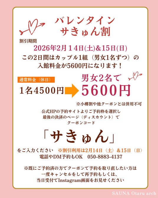 水着を着用して、男女一緒に入れるサウナ「SAUNA Otaru arch」では、バレンタインの2月14日と翌日15日の2日間、バレンタインサきゅん割と題して、カップル利用が通常9000円のところ、5600円になるクーポンの配布も始めました。