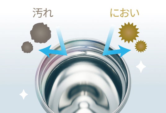 ボトル内面には環境負荷の高いフッ素コートを使わず、同等レベルの防染を独自の電解研磨技術「スーパークリーンPlus」加工により実現しています。なめらかで光沢のある加工で、汚れやにおいがつきにくく、さっと洗うだけで清潔にお使いいただけます。
