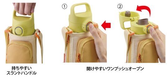 ハンドルは持ちやすく、お出かけ時に便利。ふたは、ワンプッシュで簡単にオープンするので、片手で操作して、すばやく水分補給することができます。
