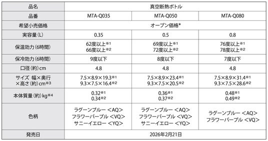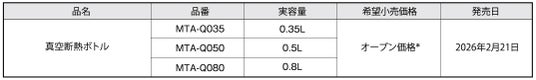 熱制御テクノロジーで世界をリードするタイガー魔法瓶株式会社(社長:菊池嘉聡、本社:大阪府門真市)は、「真空断熱ボトルMTA-Q035/Q050/Q080」を2026年2月21日(土)に発売いたします。