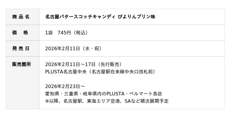 2026年2月11日(水・祝)~2月17日(火)の7日間、PLUSTA名古屋中央にて先行販売、2月23日(月)以降は東海3県のPLUSTA・ベルマート各店で順次販売される予定です。