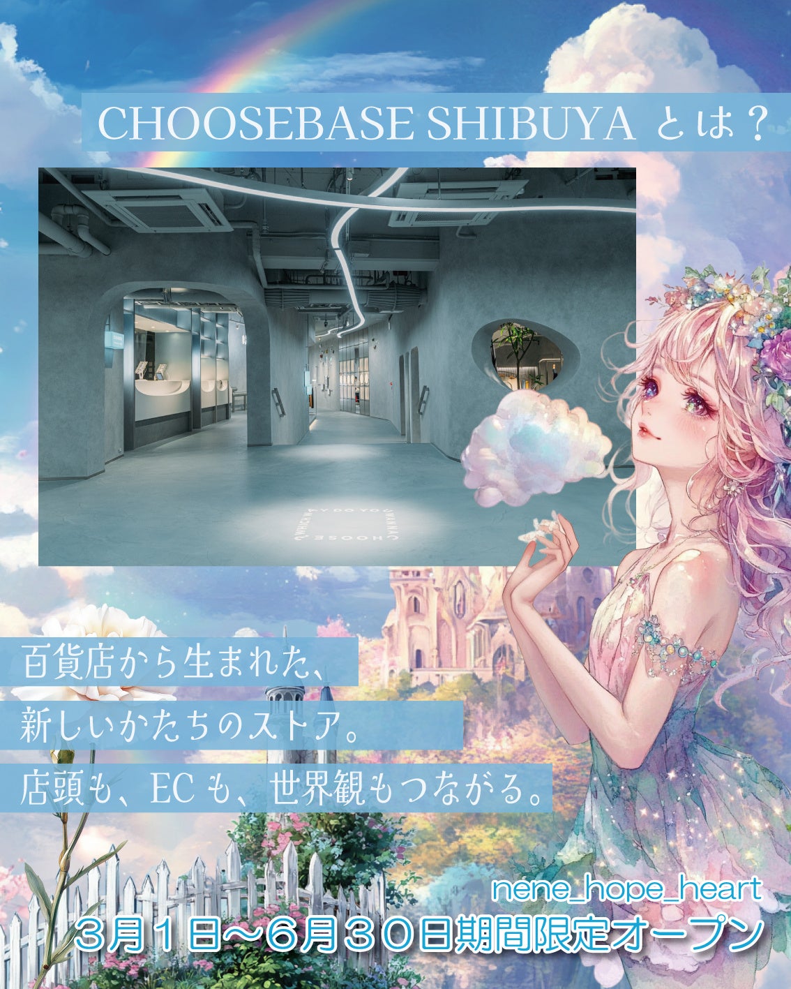 CHOOSEBASE SHIBUYAは、百貨店・そごう西武が展開する新業態です。編集性とキュレーションを軸に、従来の売場とは異なる文脈でブランドやプロダクトを紹介し、新しい出会いと体験を提供しています。今回の展開では、オンライン発の世界観ブランドをリアルな体験として提示する場として、nene_hope_heartの取り組みが紹介されます。